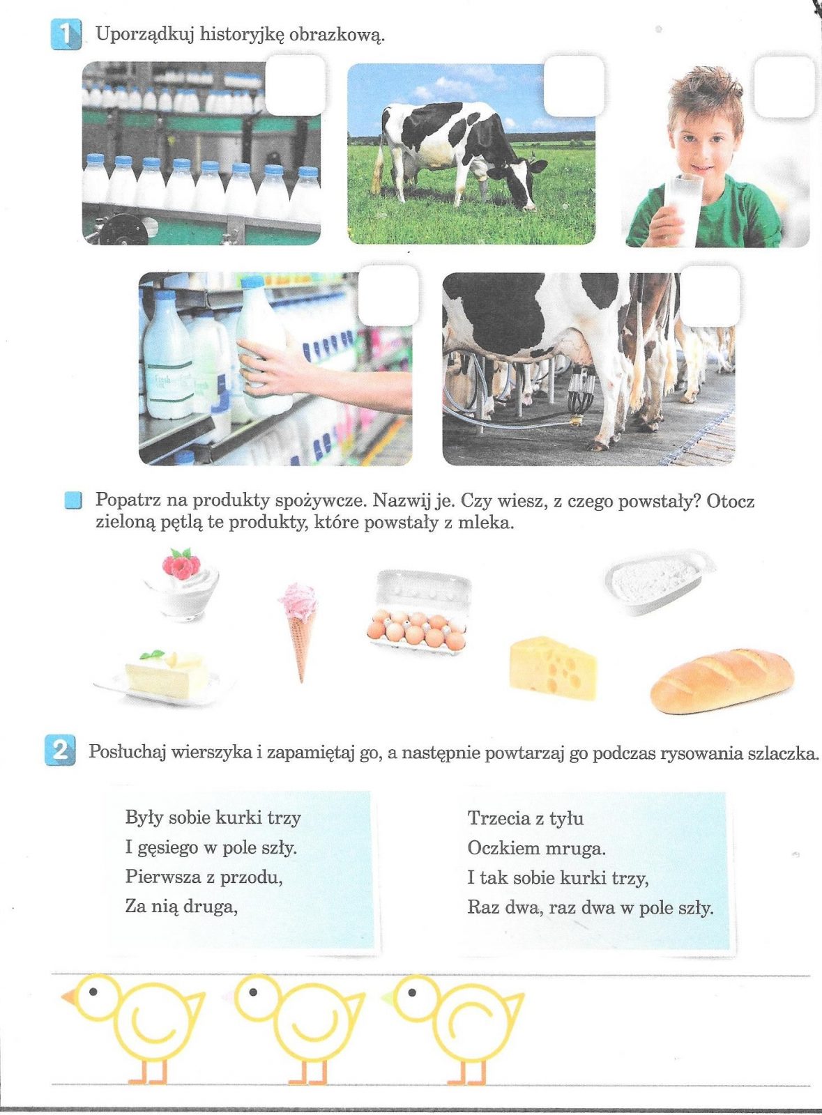1. Czy to jest zrobione z mleka? – wykonanie zadania w karcie pracy. Nazwijcie produkty spożywcze, czy wiecie z czego powstały? Otoczcie zieloną pętlą te, które powstały z mleka.
