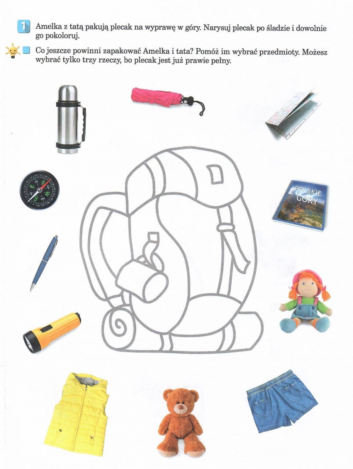 3. Pakujemy plecak- zabawa dydaktyczna, rozwiązywanie zadań w kartach pracy.