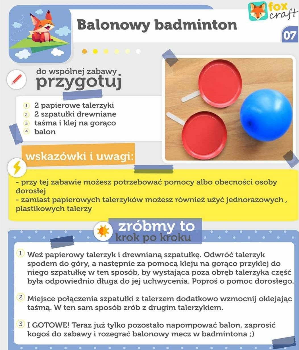 Drogie dzieci, wykonajcie balonowego badmintona według instrukcji. Wykorzystacie go do zabawy podczas wakacyjnych dni.