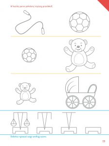Wykonaj zadanie z Kart Pracy (str. 55). Pokoloruj w każdej parze cięższy przedmiot. Dokończ rysować wagi według wzoru.