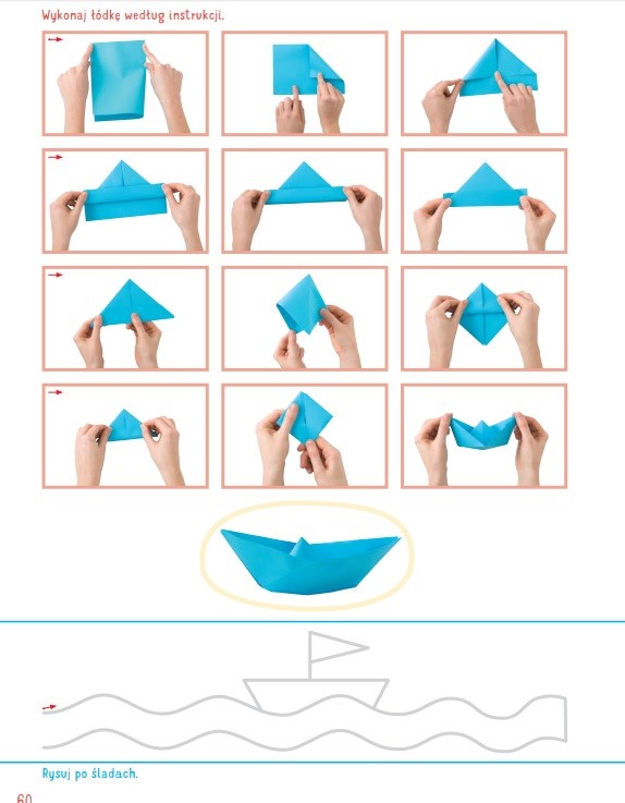 2, Wykonajcie łódkę zgodnie z instrukcją ( Karty pracy cz.4, s. 60 ). Rysujcie po śladach ( Karty pracy cz. 4, s. 59 ).